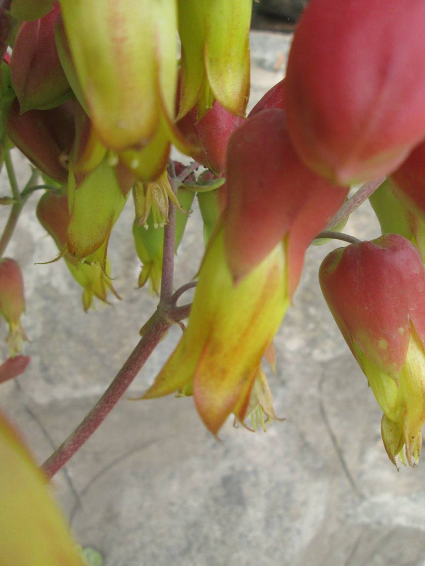Blüte einer quasi grossen Verwandten des Brutblattes ist hier in Lima nicht allzu häufig in Gärten anzutreffen. Die Pflanze ist relativ gross braucht auch etwas mehr Wasser und besseren Boden als andere Fettpflanzen, Das Blüttenhüllblatt ist rot und die Blüte selber ist gelbgrün mit leichtem roten Anhauch. Blüht wahrscheinlich erst im dritten Jahr.