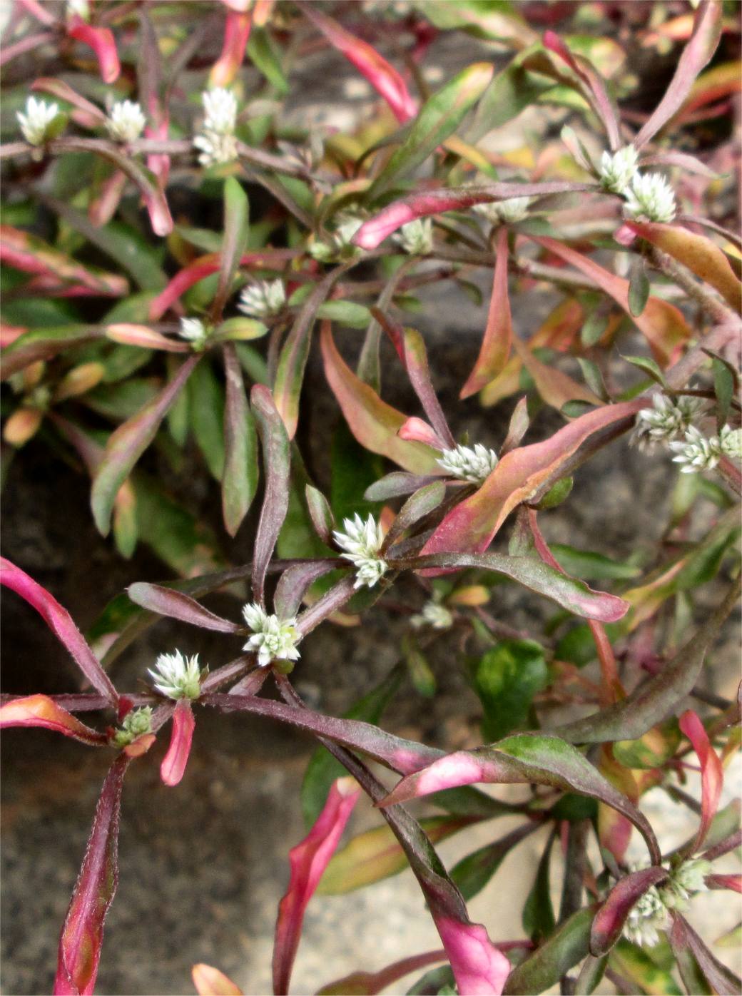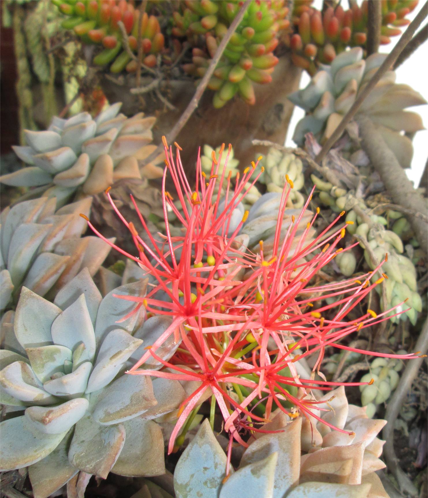 Das grüne Blatt der rot blühenden Fettpflanze ist nicht zu sehen, das was man sieht sind zwei andere Skulkulenten.