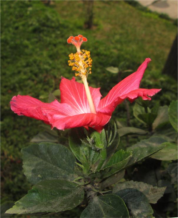 Rote Hibiskus Blüte in der Sonne, aber mit Zusatzblitz aufgehellt, und leichtem Zoom.